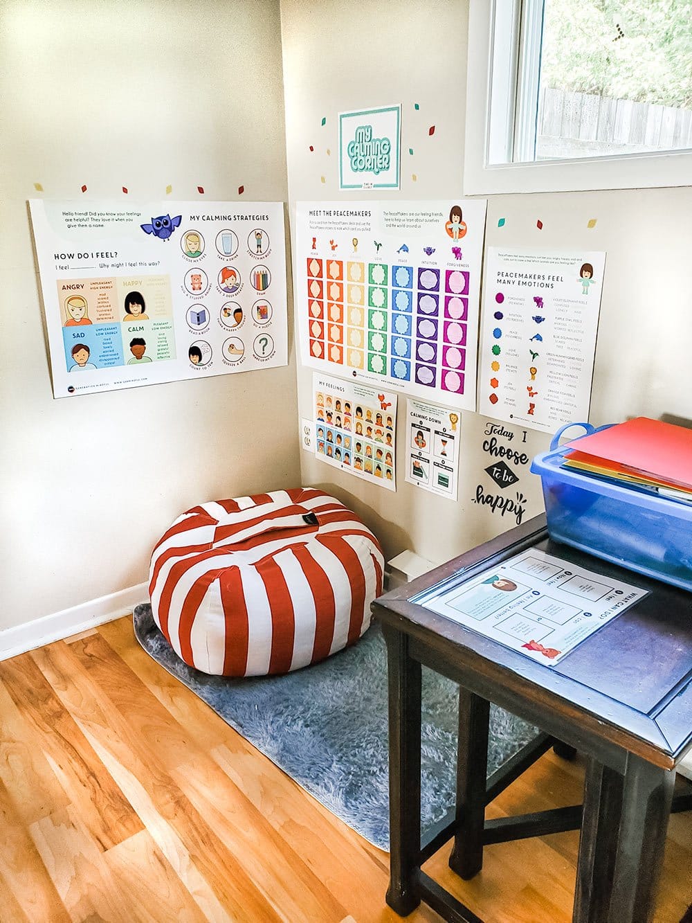 Una vez cuenten con el mobiliario necesario, es importante rotular el área con algunos recursos. Estos pueden incluir los pasos para utilizar correctamente el espacio, tableros interactivos para identificar emociones, frases positivas y motivadoras, carteles sobre las emociones o estrategias de resolución de conflictos, entre otros. Así mismo, deben incluir su caja de herramientas para la regulación emocional.